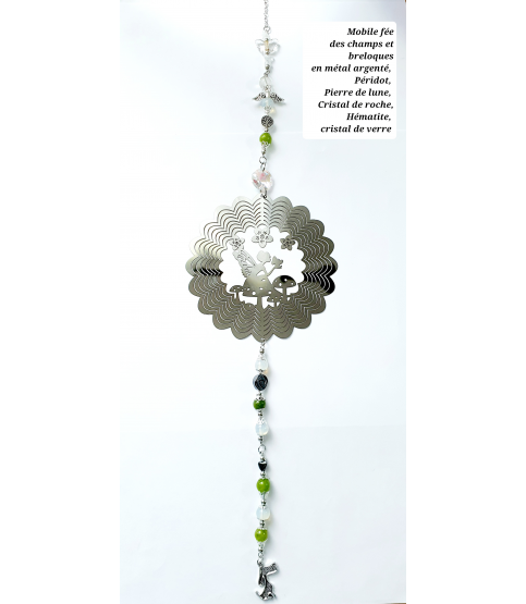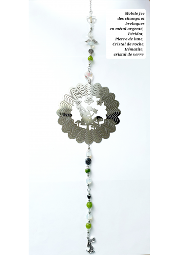 Mobile environ 53 cm de longueur, en métal argenté, péridot, pierre de lune, cristal de roche, hématite, cristal de verre.