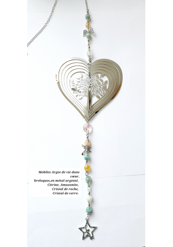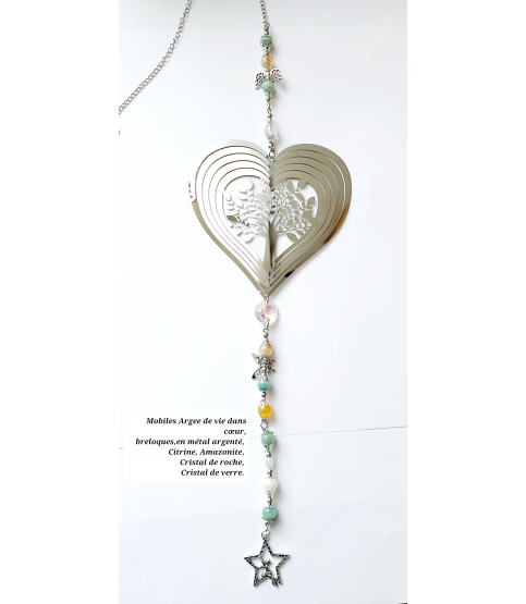Mobile environ 53 cm de longueur, en métal argenté, citrine, amazonite, cristal de roche, cristal de verre.