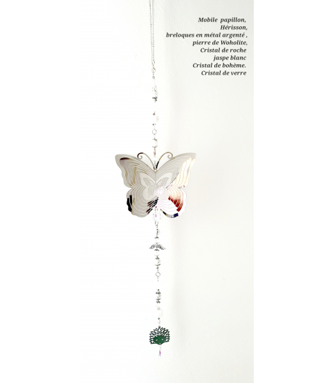 Mobile environ 53 cm de longueur, en métal argenté, pierre howlite, jaspe blanc, cristal de roche, cristal de verre, cristal de bohème. Fini par breloque hérisson.
