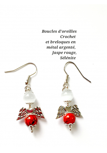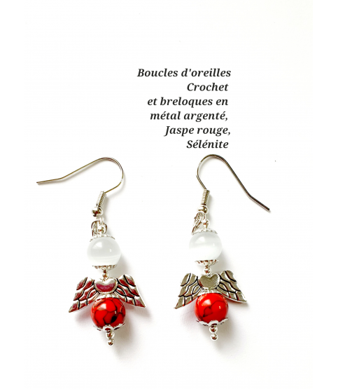 Boucles d'Oreilles Ailes d'Anges et coeur, jaspe rouge, breloque en métal argenté. Attaches en métal argenté.