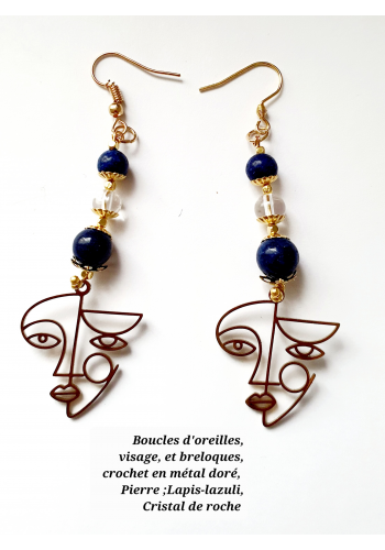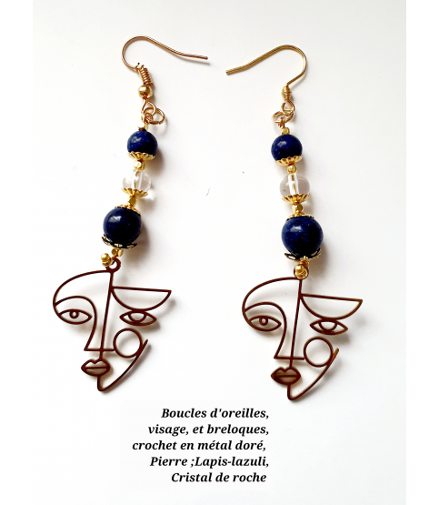 Boucles d'Oreilles Visage, lapis lazuli, cristal de roche, breloque en métal doré. Attaches en métal doré.