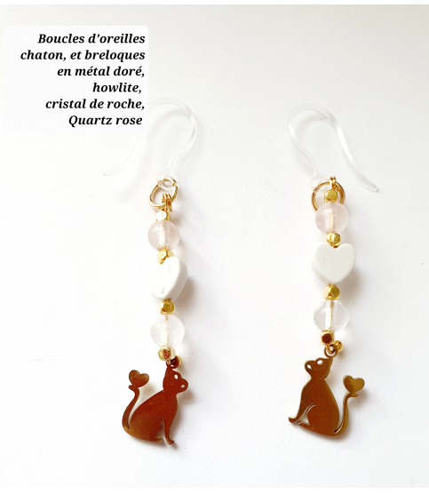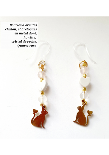 Boucles d'oreilles Chat avec coeur, howlite, cristal de roche, quartz rose, breloque en métal doré. Attaches acryliques.