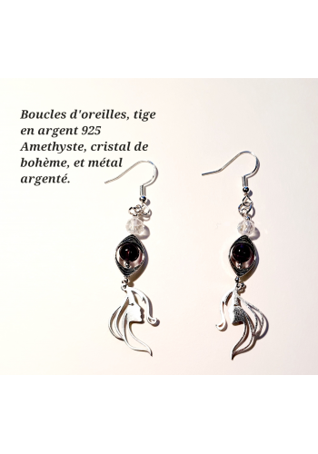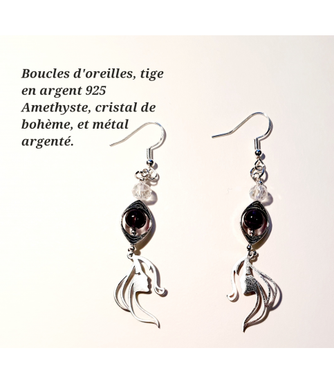 Boucles d'oreilles Visage Femme Améthyste, cristal de bohème, breloque en métal argenté. Attaches en argent 925/1000.