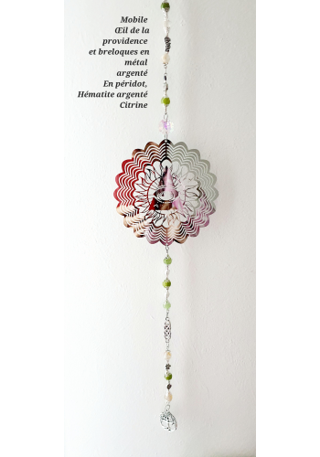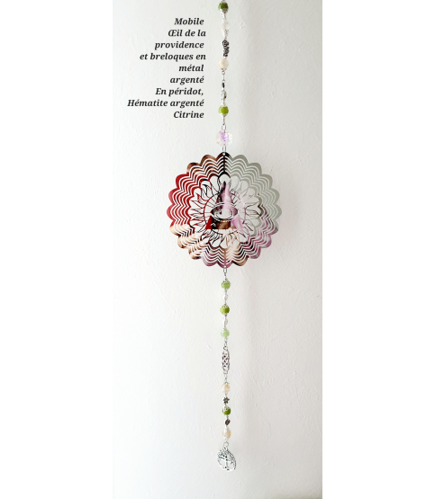 Mobile Oeil de la Providence environ 53 cm de longueur, en métal argenté, péridot, hématite argenté, citrine.