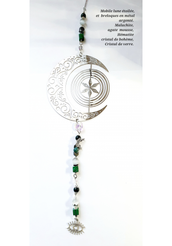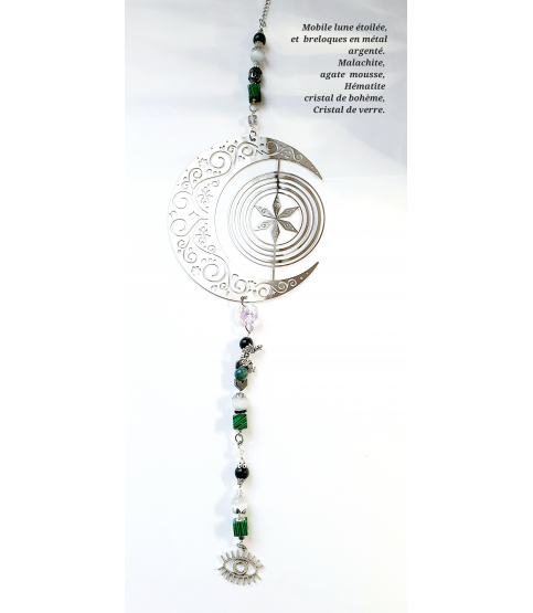 Mobile Lune Étoilée 53 cm de longueur, en métal argenté, malachite, agate mousse, hématite, cristal de bohème, cristal de verre. Fini par un oeil.