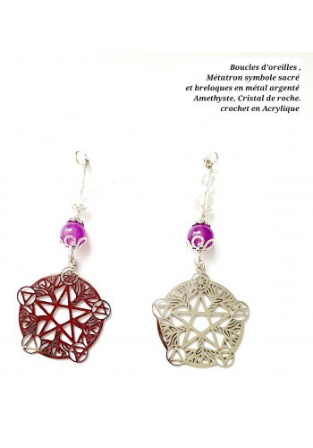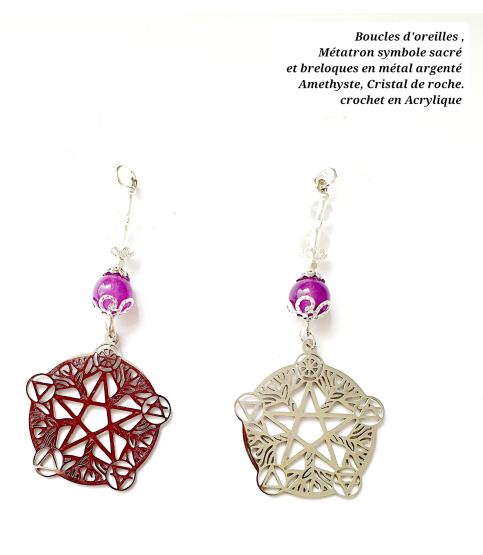Boucles d'Oreilles Métatron, symbole sacré. Breloques en métal argenté, améthyste, cristal de roche. Attaches acryliques.