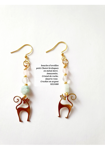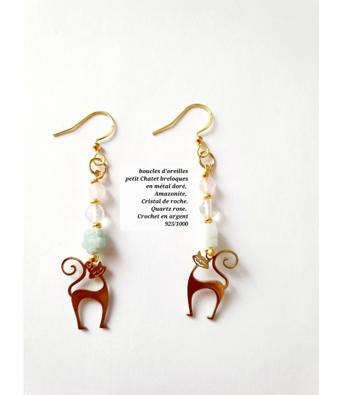Boucles d'Oreilles en amazonite, cristal de roche, quartz rose, breloque chat en métal doré. Attaches en argent 925/1000.