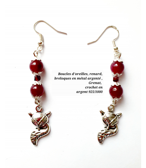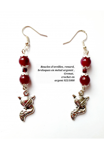 Boucles d'Oreilles en grenat, breloque en métal argenté. Attaches en argent 925/1000.