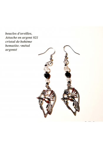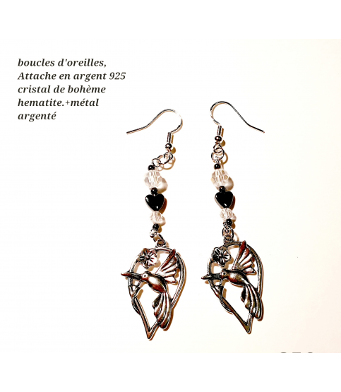 Boucles d'Oreilles en cristal de bohème, hématite, breloque en métal argenté. Attaches en argent 925/1000.